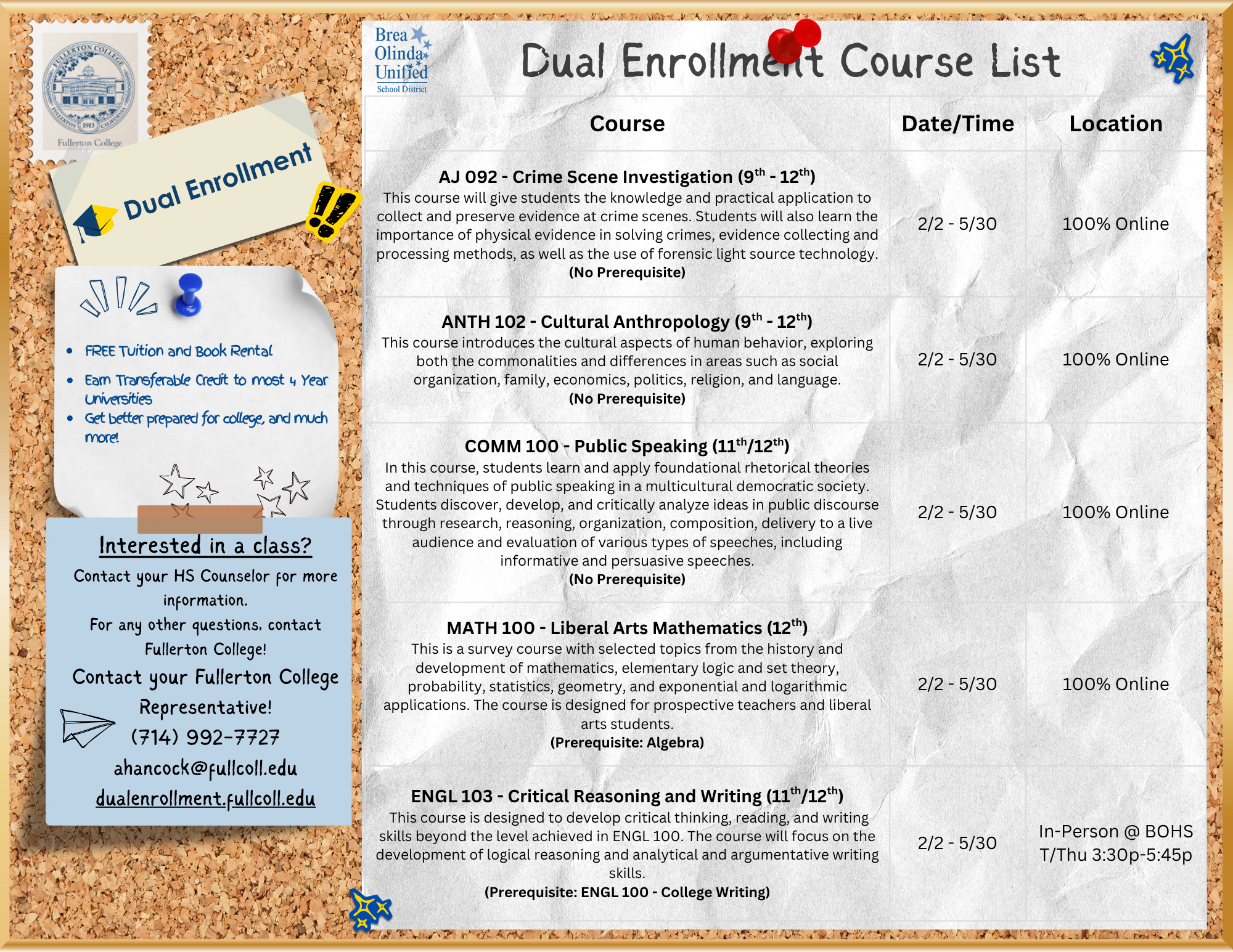 These courses are offered for all of Brea-Olinda Unified School District and are free to take via Fullerton College’s Dual Enrollment program! These courses are online and asynchronous (with the exception of ENGL 103) and run during the Spring 2026 semester from Feburary 2nd – May 30th. Be sure to talk to your counselor or college career technician for more information.